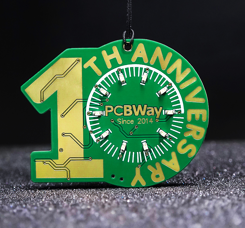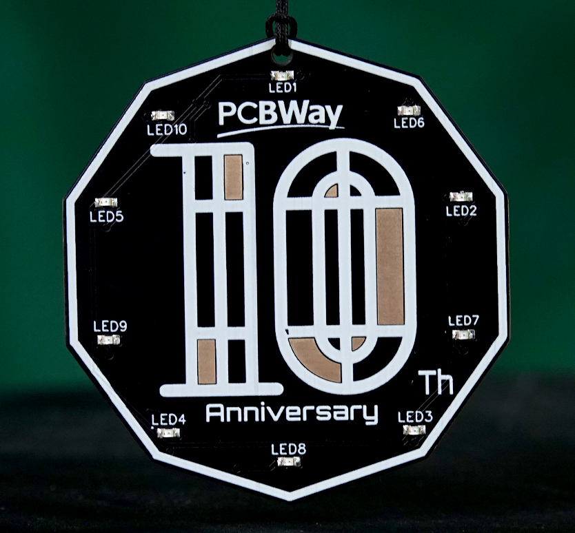 It is a decagon, featuring 10 LEDs that symbolize PCBWay's 10th anniversary. The front displays the number "10" divided into 12 sections, with 6 sections being pads without solder mask, representing the special date of June 12th, the founding day of PCBWay. The back of the badge features a rocket, symbolizing a wish for PCBWay's future success. Surrounding the rocket, the silkscreen text lists our main services: "PCB, PCBA, Sheet Metal Fabrication, Injection Molding, CNC, and 3D Printing". Each service icon represents a key step in the company's development, highlighting the company's commitment to innovation and adaptability.